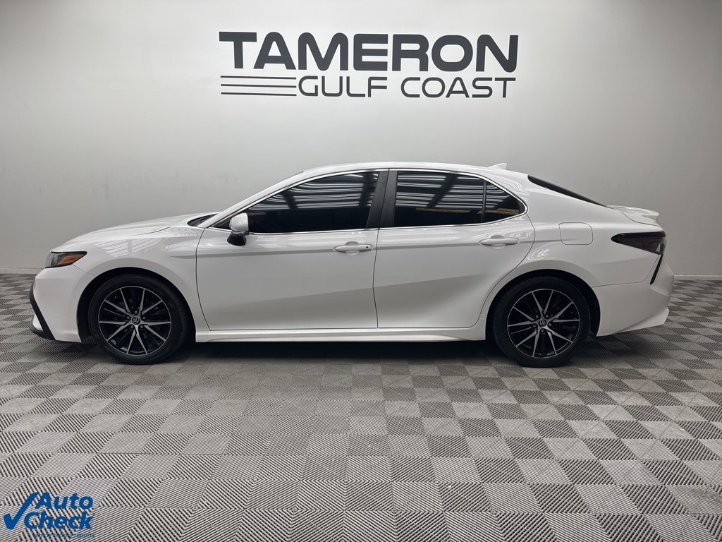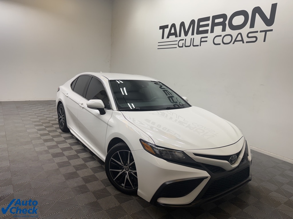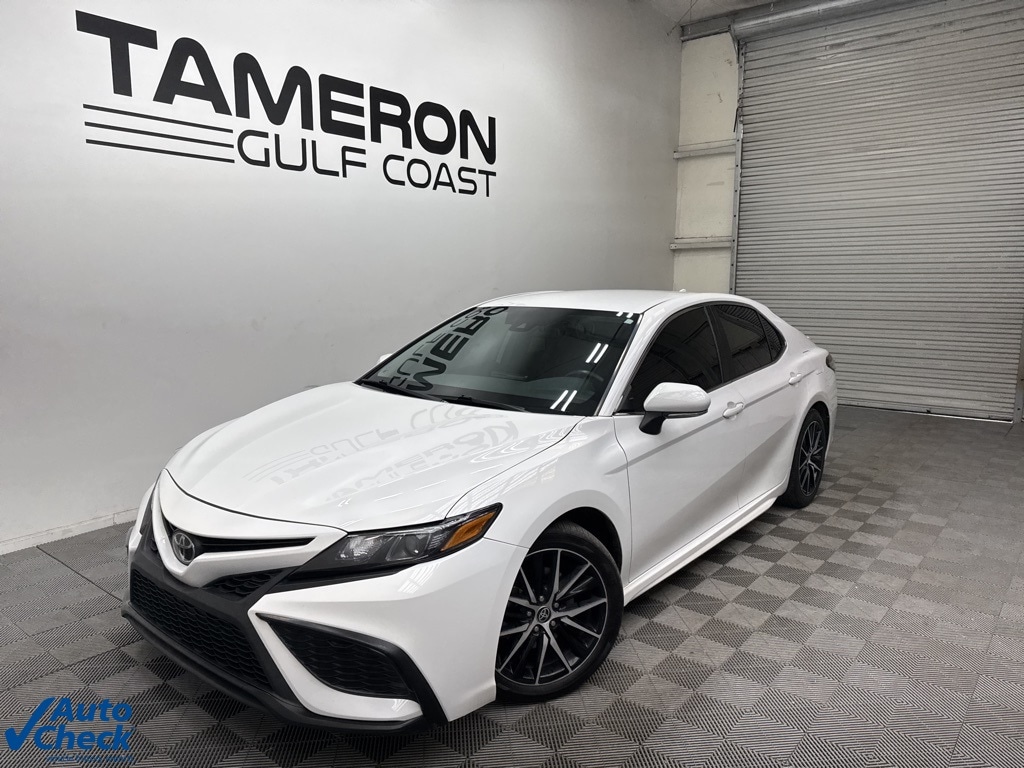 White 2023 Toyota Camry SE AWD 8-Speed Automatic 2.5L I4 DOHC 16V Black Artificial Leather, 6 Speakers, ABS brakes, Active Cruise Control, Air Conditioning, Alloy wheels, AM/FM radio: SiriusXM, Automatic temperature control, Electronic Stability Control, Front dual zone A/C, Heated door mirrors, Illuminated entry, Low tire pressure warning, Power driver seat, Power steering, Power windows, Radio data system, Radio: Audio, Remote keyless entry, Traction control.